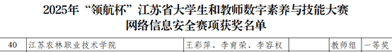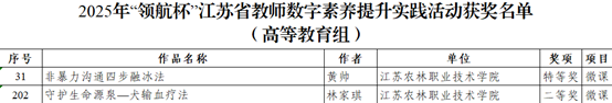 我院教师在2025年“领航杯”江苏省教师信息素养提升实践活动和数字素养与技能大赛中表现优异,荣获特等奖1项、一等奖1项、二等奖1项。其中,教师信息素养提升实践活动中,我院农学园艺学院黄帅老师获特等奖,畜牧兽医学院林家琪老师获二等奖;教师数字素养与技能大赛网络信息安全赛项中,信息工程学院王彩萍、李育荣、李容权老师获教师组一等奖。